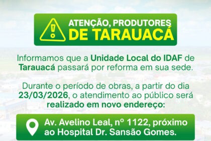 O Instituto de Defesa Agropecuária e Florestal do Acre (Idaf) informa aos produtores rurais de Tarauacá que a sede do órgão no município passará por reforma. Durante o período das obras, os atendimentos serão realizados em um novo endereço: Avenida Leal, nº 1122, próximo ao Hospital Dr. Sansão Gomes. A orientação é que os produtores procurem o local provisório para acessar os serviços normalmente oferecidos pelo órgão, sem prejuízo no atendimento.