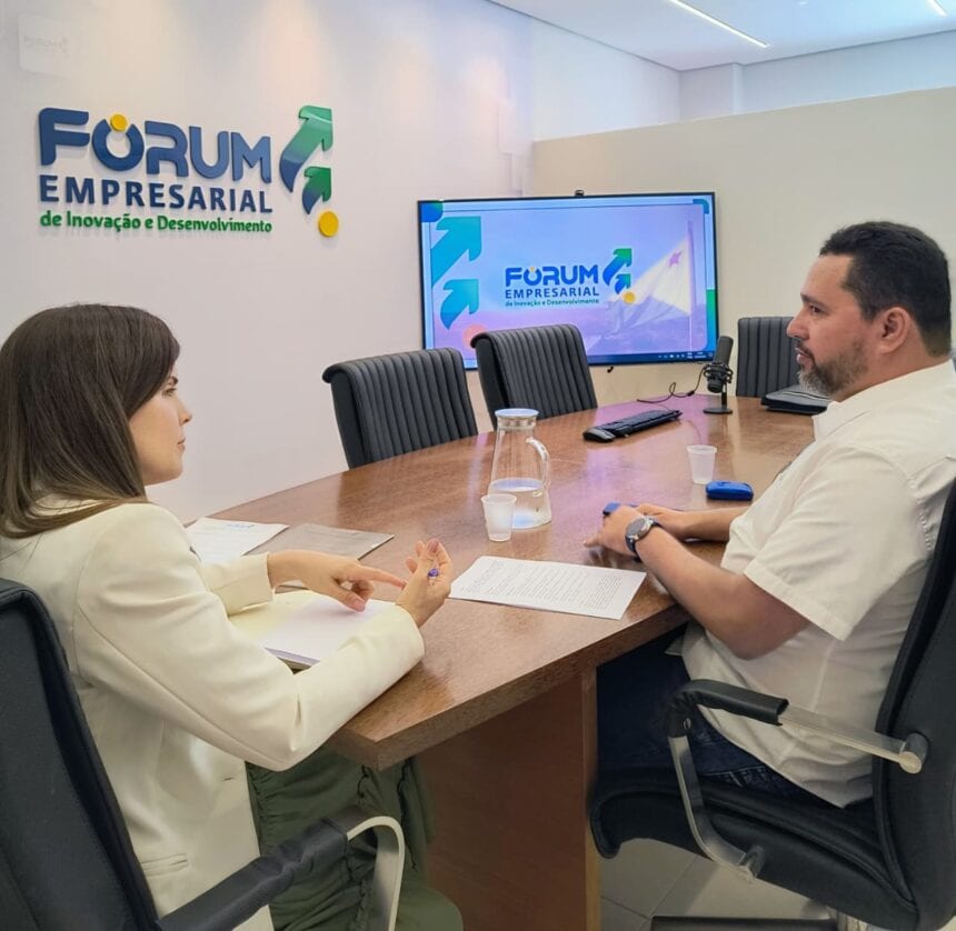 A coordenadora do Fórum Empresarial de Inovação e Desenvolvimento do Acre, Tíssia Veloso, e o economista Rubicleis Gomes debatem os temas a serem objeto de estudo (Foto: Cedida)