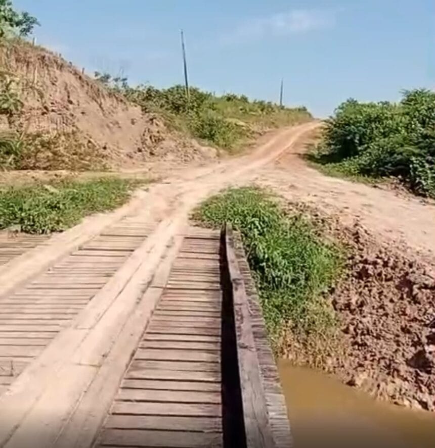 Moradores da Aldeia Coração da Floresta enfrentam dificuldades com pontes quebradas e lama no Ramal do Armando, única via de acesso à comunidade.