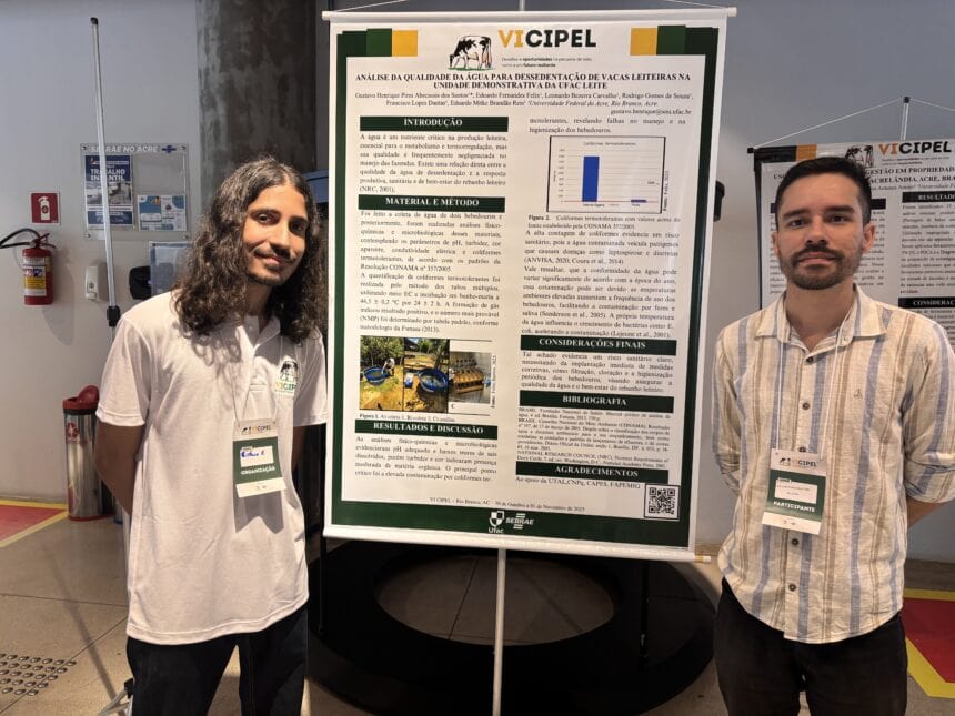 Durante o Cipel 2025, o acadêmico de Medicina Veterinária Gustavo Henrique apresentou o projeto “Análise da Qualidade da Água para Dessedentação de Vacas Leiteiras na Unidade Demonstrativa da UFAC Leite”, desenvolvido sob a orientação do professor Eduardo Mitke. O estudo revelou dados preocupantes sobre a qualidade da água utilizada nas propriedades leiteiras e seus impactos diretos na produtividade e na saúde dos rebanhos.