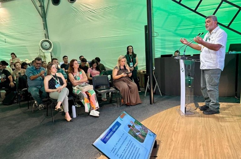 Lenildo Morais apresenta o projeto Conab Raiz na COP 30, destacando a distribuição nacional de kits de mecanização para a agricultura familiar. Foto: Reprodução.