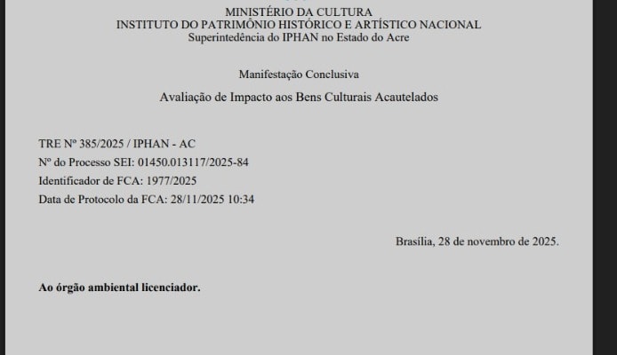 O convite do Fórum Empresarial de Inovação e Desenvolvimento do Acre acontece na mesma semana em que o Iphan publicou no Diário Oficial da União a Instrução Normativa n.º 6. Trata-se de um conjunto de procedimentos administrativos que o Instituto do Patrimônio Artístico Nacional tem que executar em razão da possibilidade de impactos em bens culturais que estão sob a responsabilidade federal.