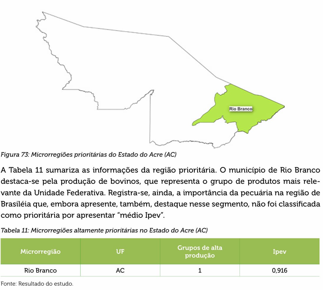 Das cinco microrregiões do Acre (regionais), apenas Rio Branco, localizada ao leste do Estado, foi classificada como alta prioridade, apresentando “alto Ipev” e “alta produção”. É a região que já foi classificada pelo Governo do Acre como Zona Especial de Desenvolvimento (ZED).