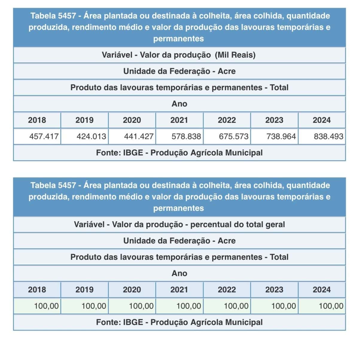 Dados da Produção Agrícola Municipal (PAM), do Instituto Brasileiro de Geografia e Estatística (IBGE), mostram que o valor da produção das lavouras temporárias e permanentes no Acre registrou crescimento contínuo nos últimos anos, alcançando em 2024 o maior patamar da série histórica iniciada em 2018.