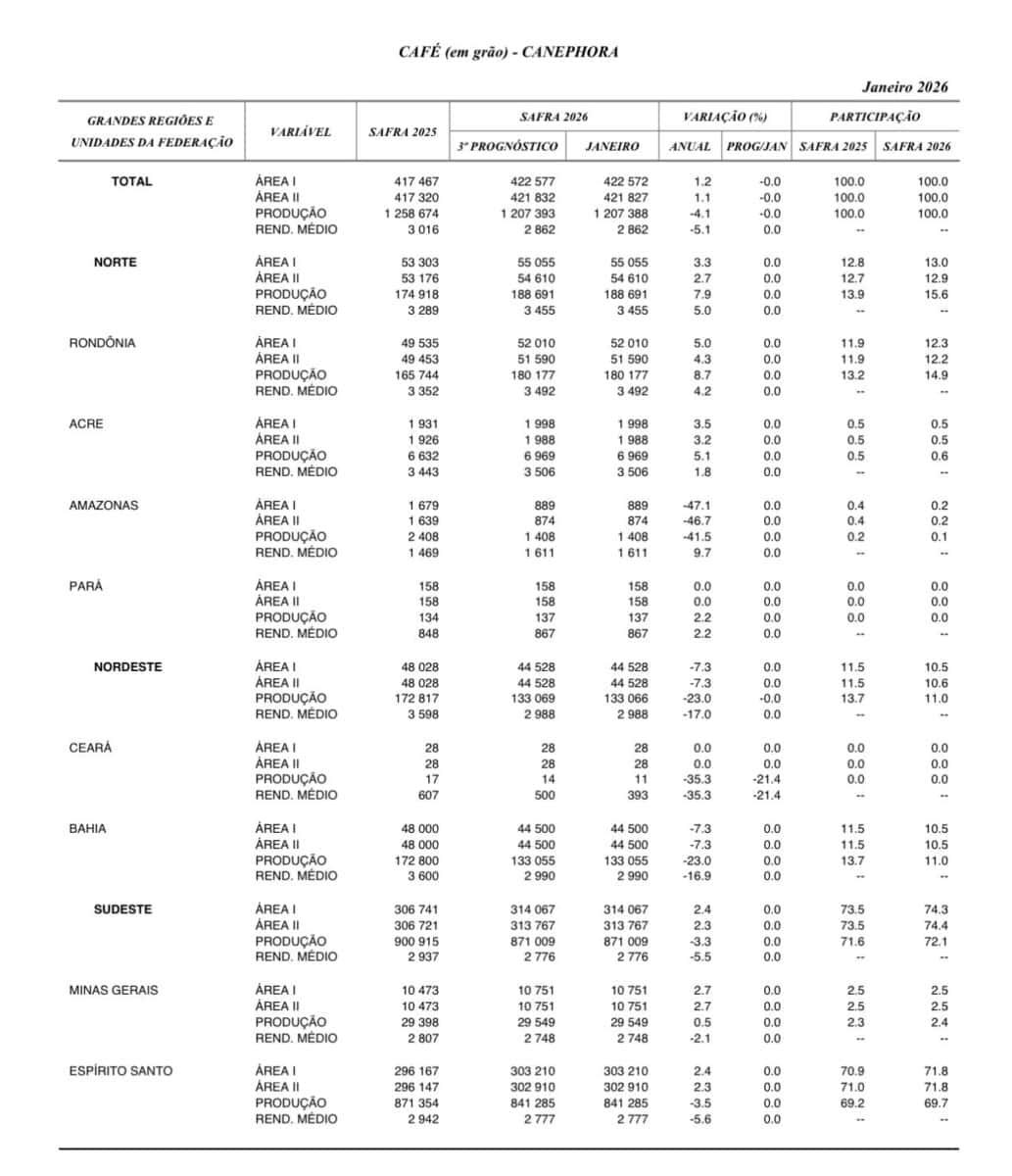 De acordo com o levantamento, a produção acreana de café está estimada em 6.969 toneladas na safra 2026, frente às 6.632 toneladas registradas em 2025, o que representa crescimento de 5,1%. O resultado é impulsionado principalmente pela ampliação da área plantada e pelo ganho no rendimento médio das lavouras.