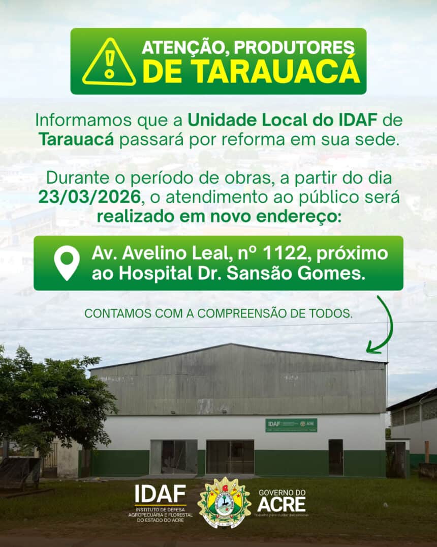 O Instituto de Defesa Agropecuária e Florestal do Acre (Idaf) informa aos produtores rurais de Tarauacá que a sede do órgão no município passará por reforma.