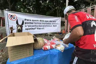 Logo na entrada do clube onde ocorre o evento, os organizadores montaram uma mesa com pães e mortadelas – referência…