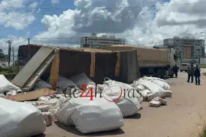 A extensão de uma carreta bitrem carregada de fardos de açúcar tombou…