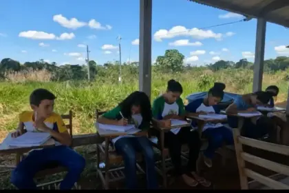 Alunos de uma comunidade rural do Acre seguem tendo aula em um…
